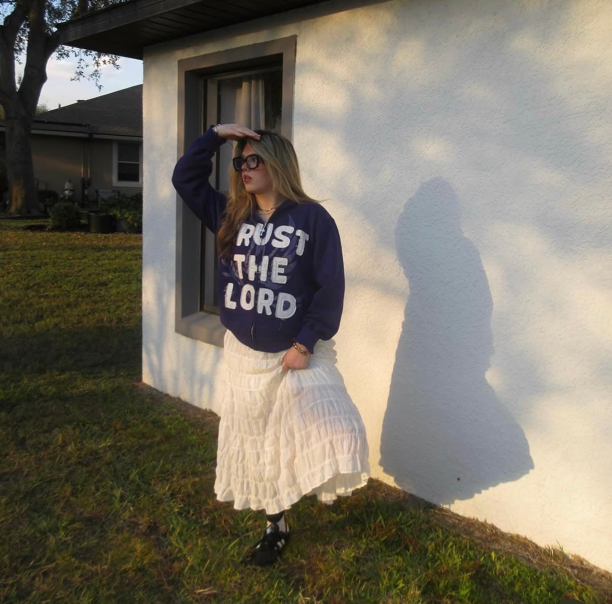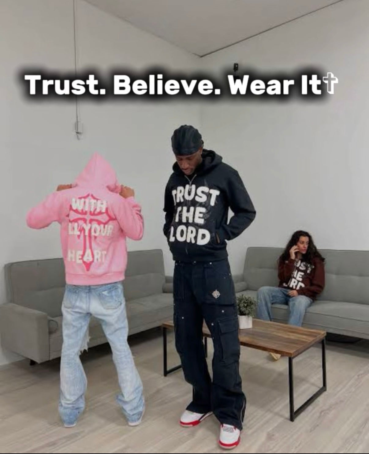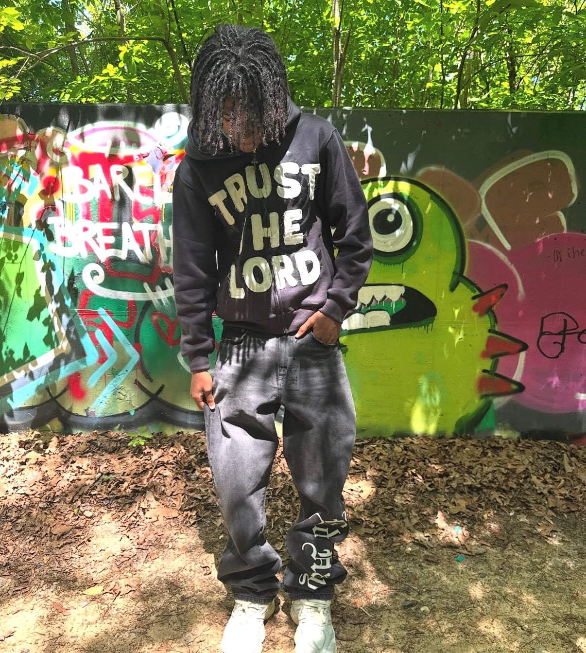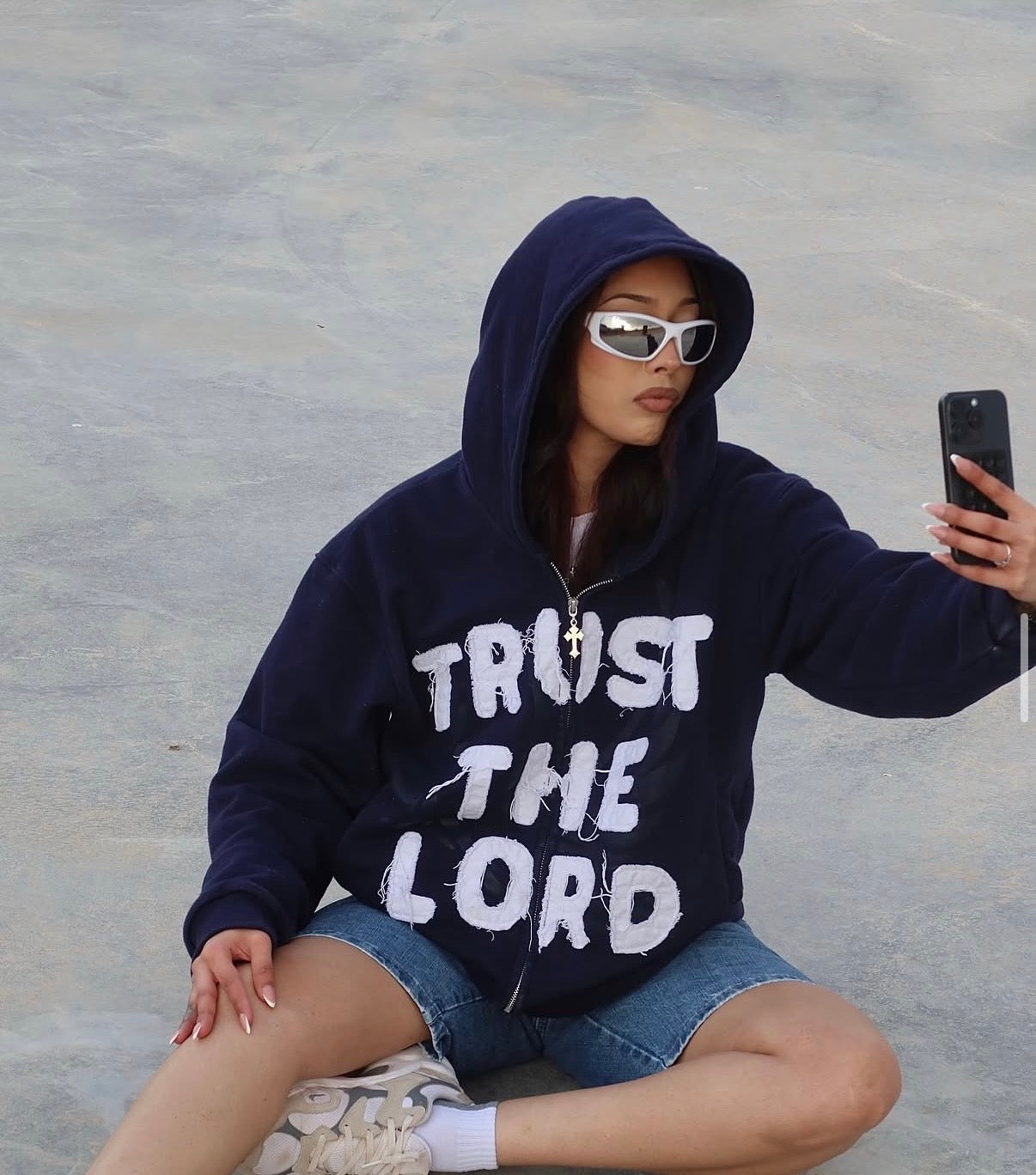“‘Trust The Lord’ Zip-Up Hoodie – a bold and uplifting design with 3D embroidered letters and an inspiring message of faith and trust in God.”